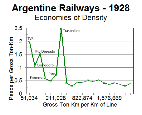 The three privately-owned railways that operated standard gauge lines, the North Eastern, Entre Rios and Buenos Aires Central, showed an unexpected relationship between their operating expenses and traffic density, the expenses being higher where the traffic density was also higher.